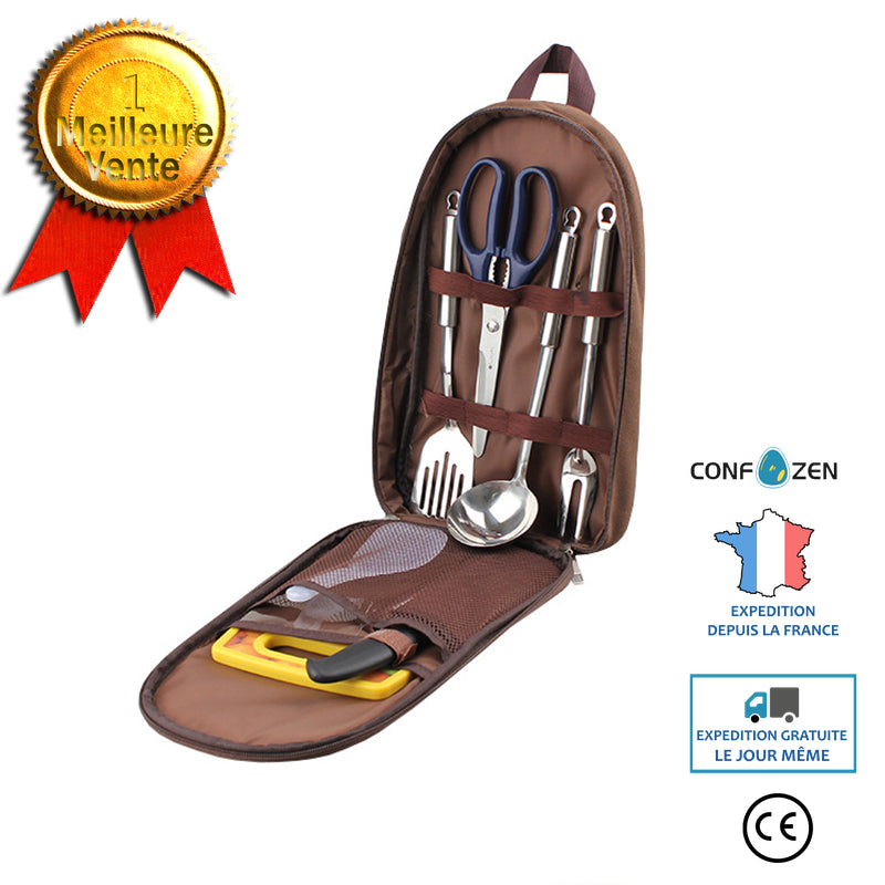 Contenu : planche à découper + couteau de cuisine + spatule + spatule à riz + ciseaux + cuillère à soupe + fourchette à viande + sac de rangement ethnique
