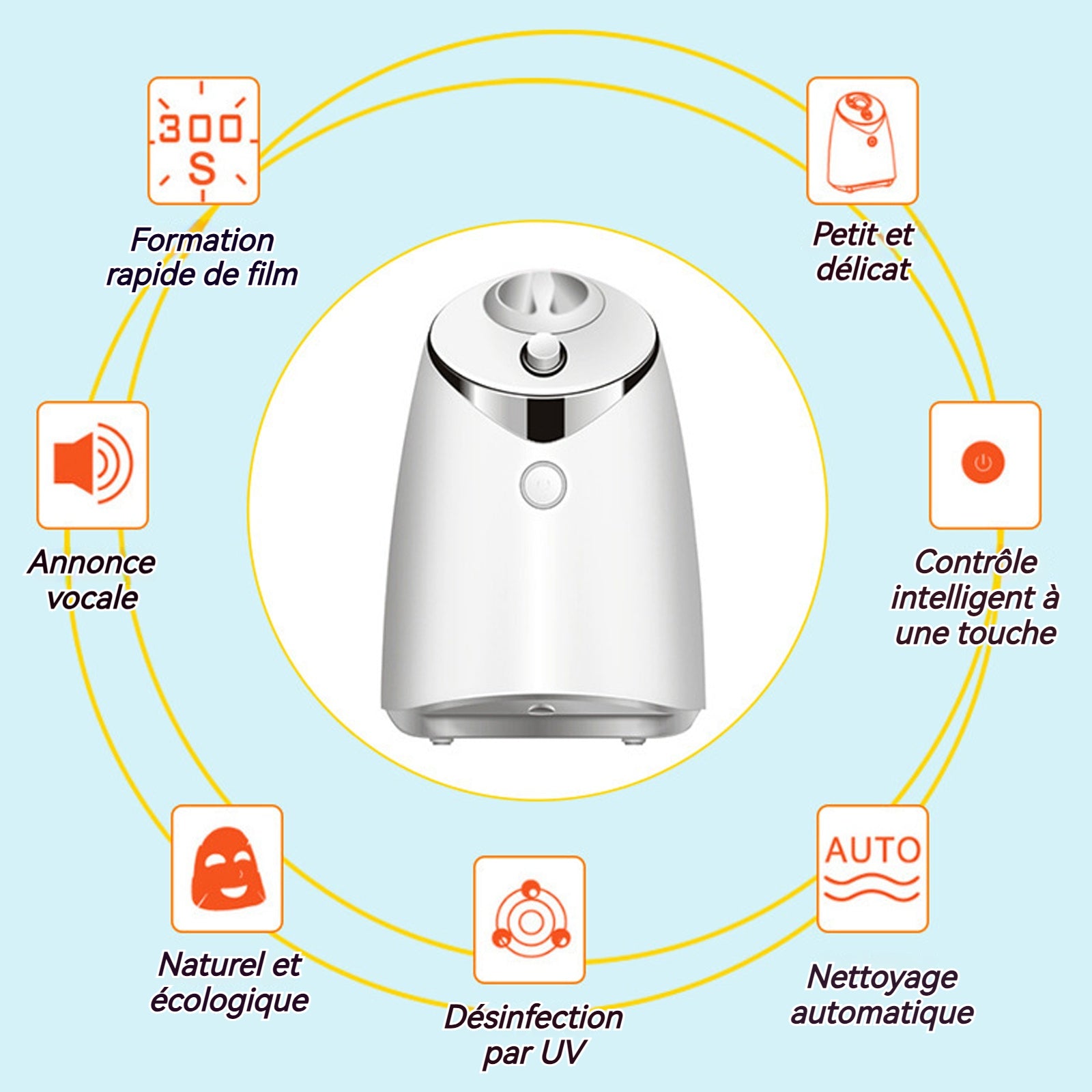 Liste du contenu : Appareil principal x1 + plateau à masque x1 + brosse de nettoyage x1 + contenant de 100ML + raclette à masque x1 + collagène x32