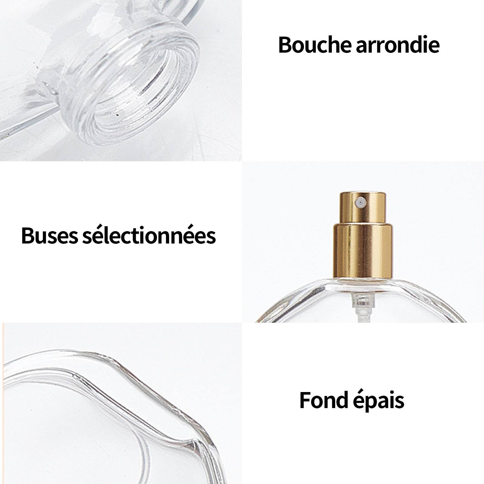 4.Fond de flacon épaissi:Le fond du flacon de parfum est fabriqué en matériau épaissi pour plus de stabilité et de résistance à l'usure ; le fond épaissi améliore la stabilité et la durabilité.