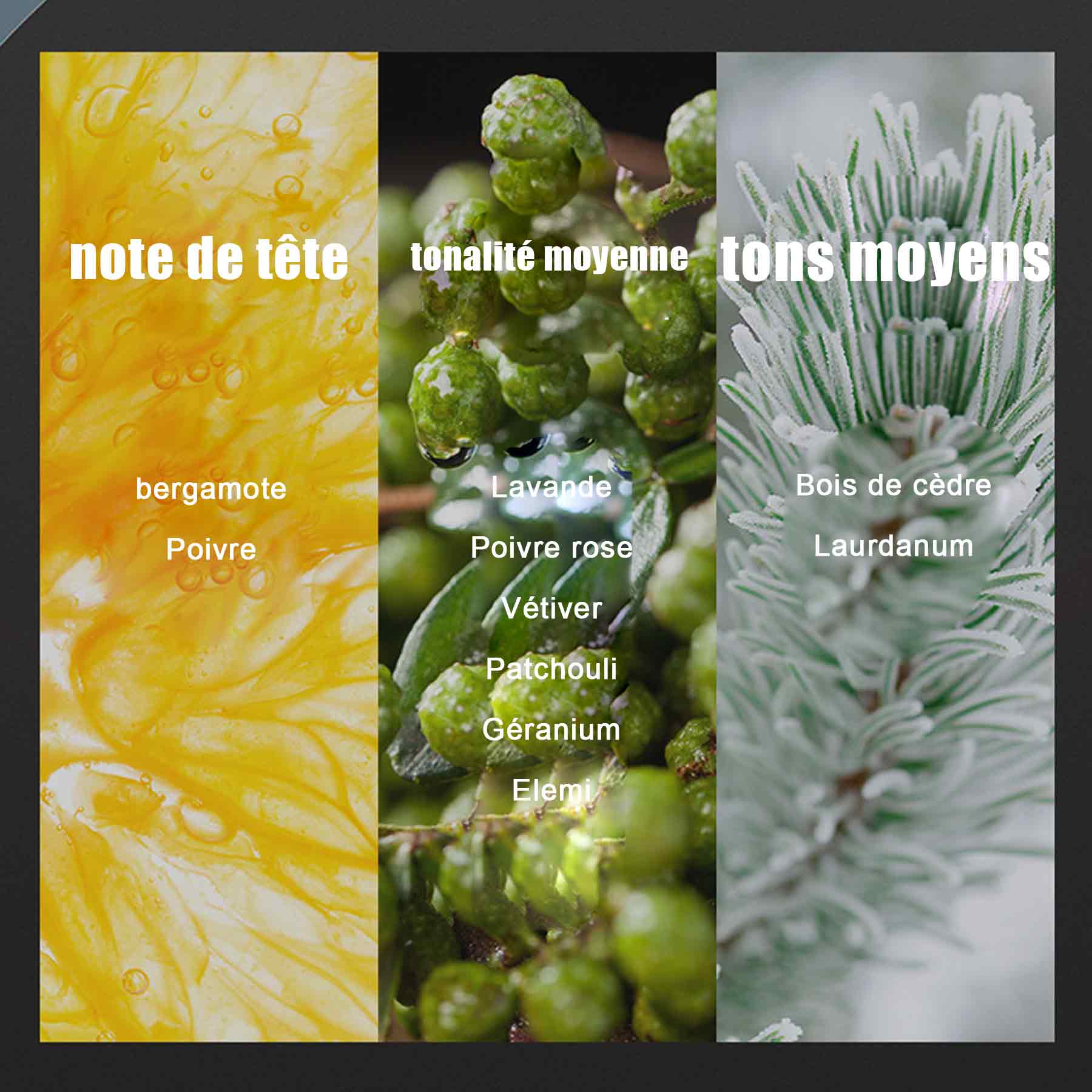 Parfum : Eau de Cologne + Patchouli + Notes boisées + Ébène