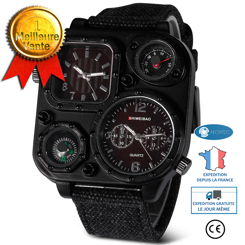 INN® Montre à quartz personnalité créative des hommes multi-fuseaux horaires sport denim calendrier heure mondiale GMT deux places