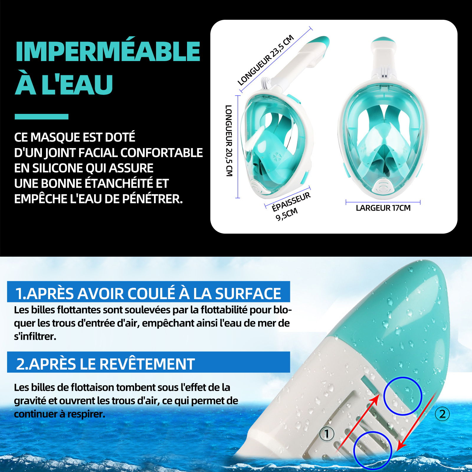 4. Conception du tuba : Ce produit est équipé d'une valve unidirectionnelle et d'un système à bouée, empêchant l'air expiré de circuler. Lorsque le tuba entre en contact avec l'eau, la respiration reste normale.