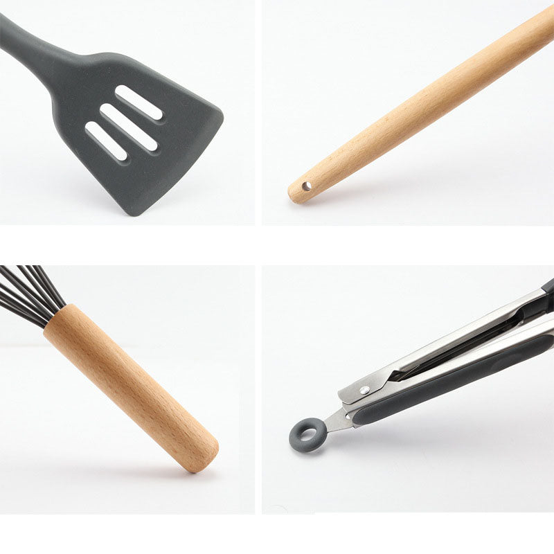 Ensemble de 11 pièces d'ustensiles de cuisine en silicone avec seau en bois Résistance aux températures élevées -Kaki