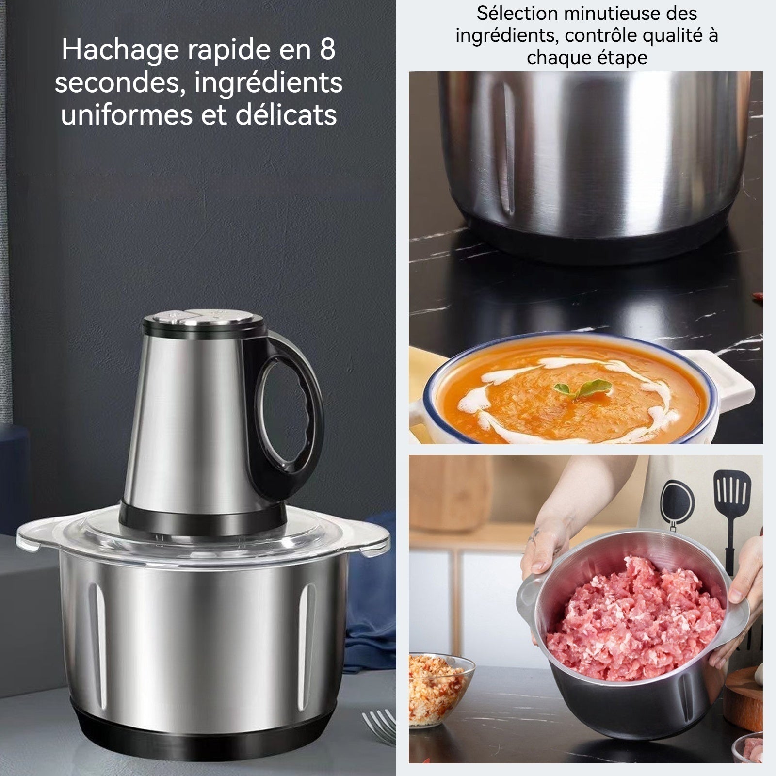 3. Grande capacité de 5 litres : Ce hachoir électrique de cuisine est doté d'un bol en acier inoxydable d'une capacité de 5 litres, plus solide, plus sain, plus durable et plus résistant aux chocs que les bols en verre. C'est le meilleur choix pour préparer de délicieux plats pour vos proches.
