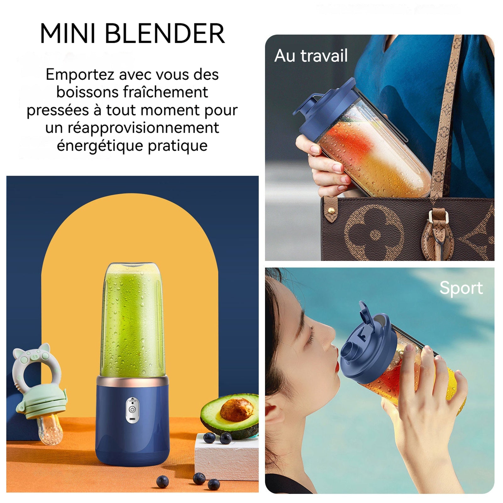 Mini Blender 9,5 x 9,5 x 22 cm 400 ml grande batterie de 1500 mAh lame en acier inoxydable 304 à 6 lames puissance puissante