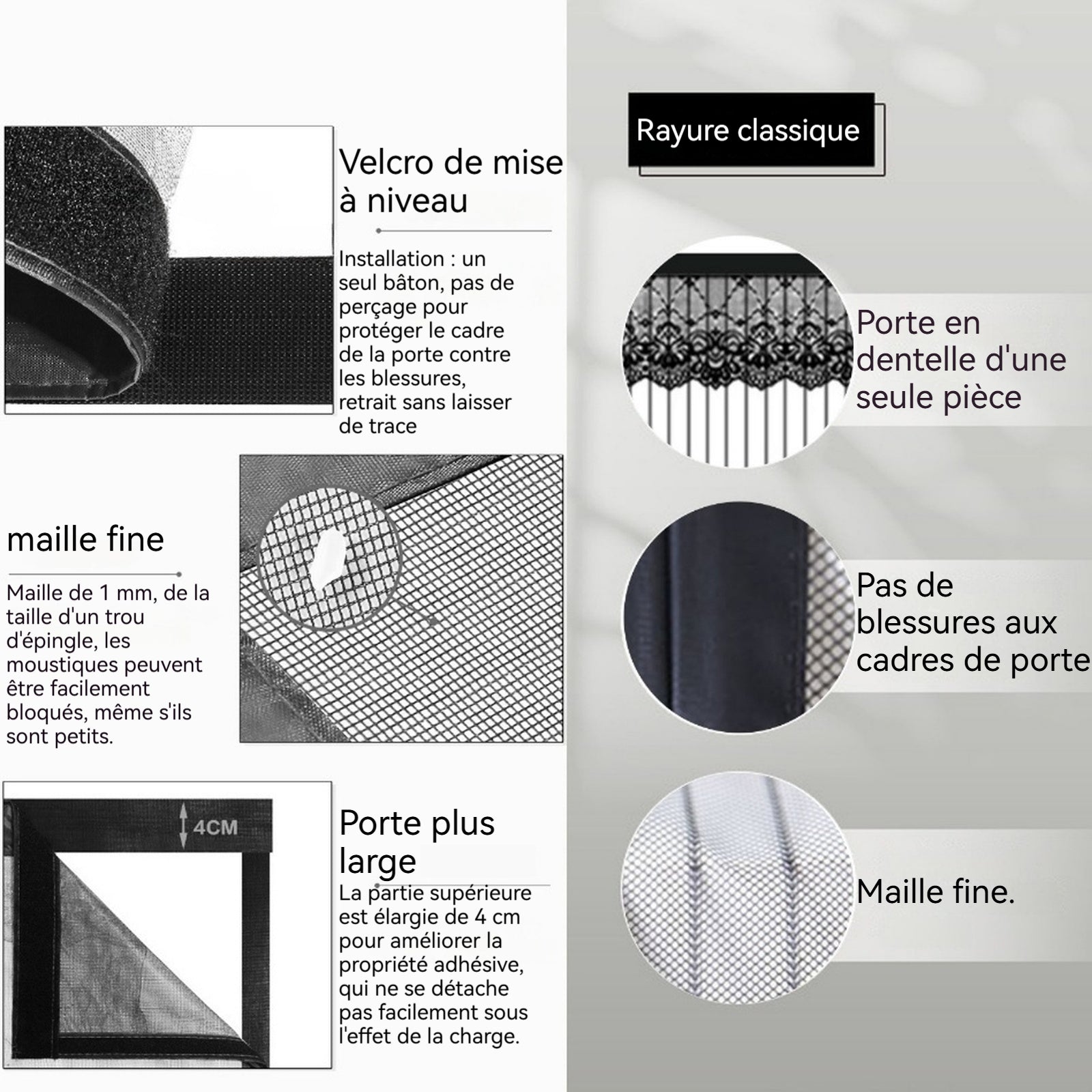 3. Design silencieux : Ce produit est doté d'un aimant intégré pour une fermeture rapide en double couche, permettant des entrées et sorties silencieuses, créant une atmosphère tranquille et confortable chez vous, et améliorant la qualité de votre vie.