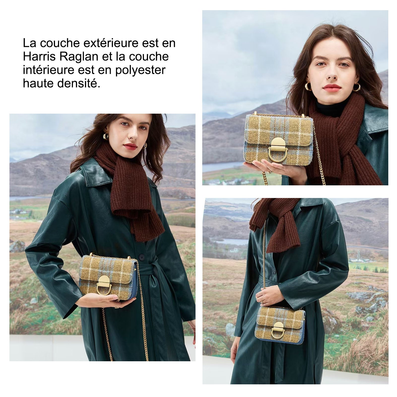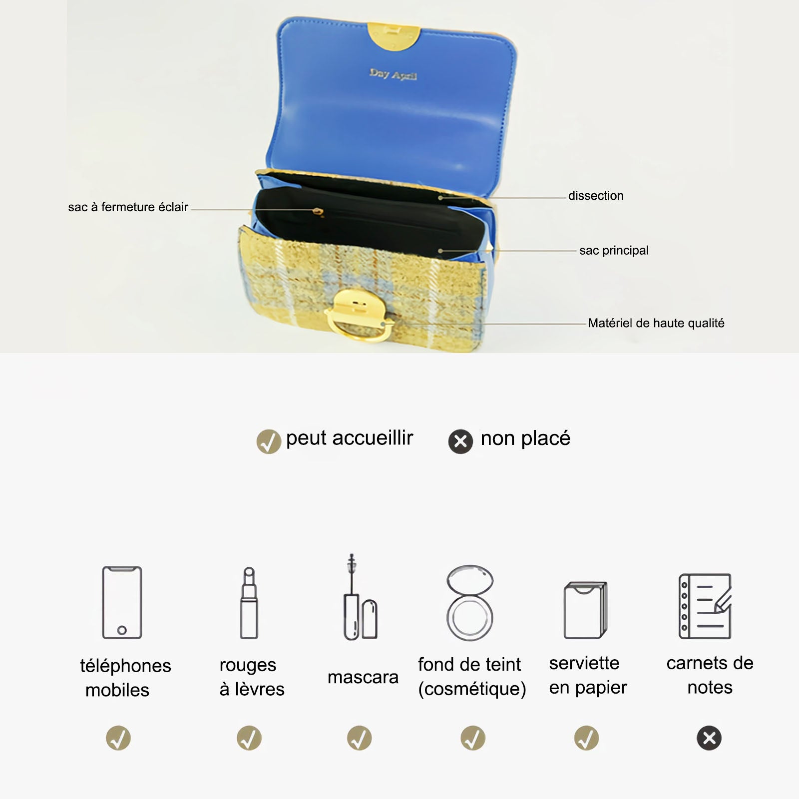 1.Motif à carreaux classique: Ce sac bandoulière est fabriqué en tweed Harris à carreaux bleu et jaune, combiné avec du cuir ultra-fibre, montrant une parfaite fusion de classicisme et de modernité.