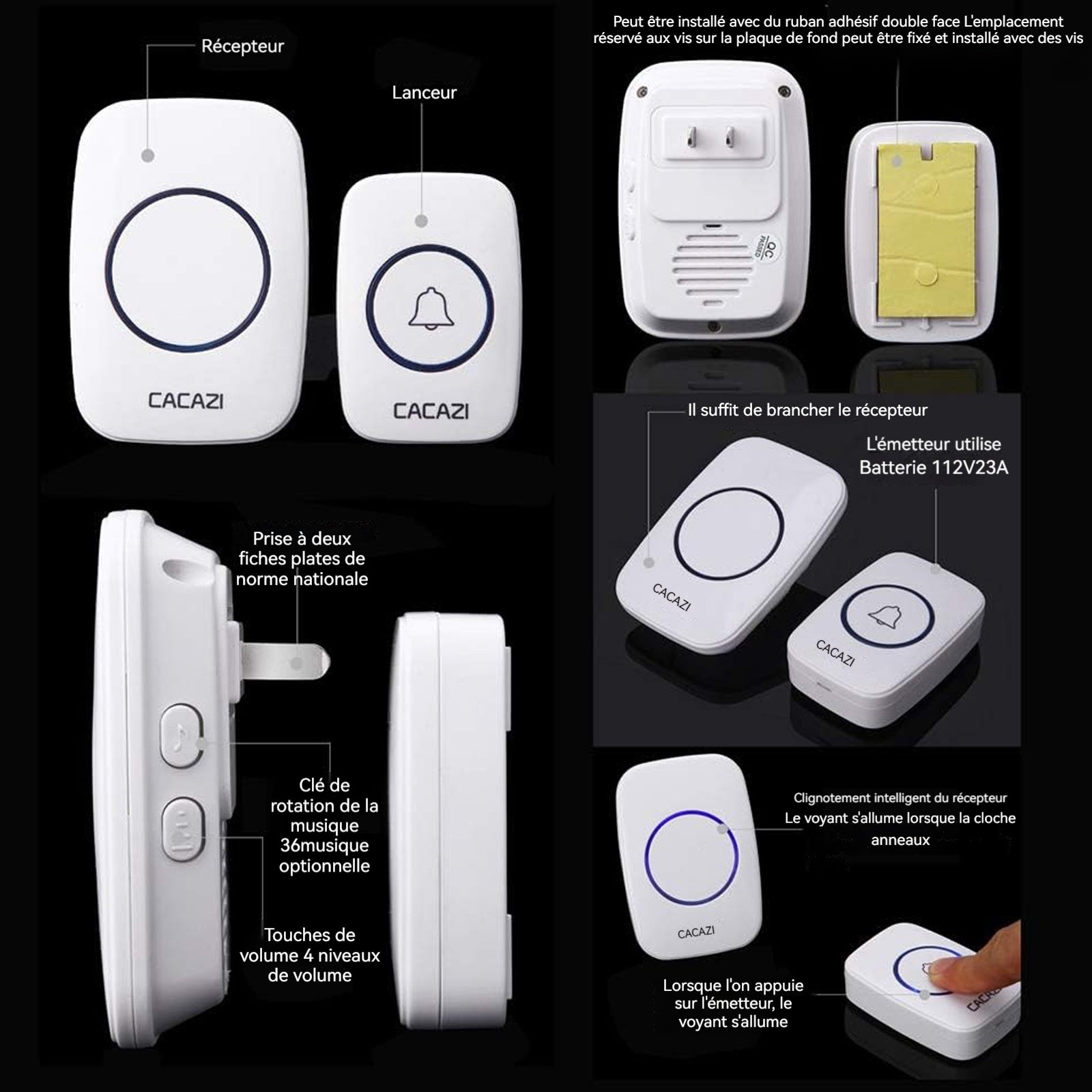 2. Carillons puissants et 4 niveaux de volume : le récepteur de sonnette enfichable dispose de 36 mélodies et de 4 niveaux de volume réglables allant de 0 à 110 dB.