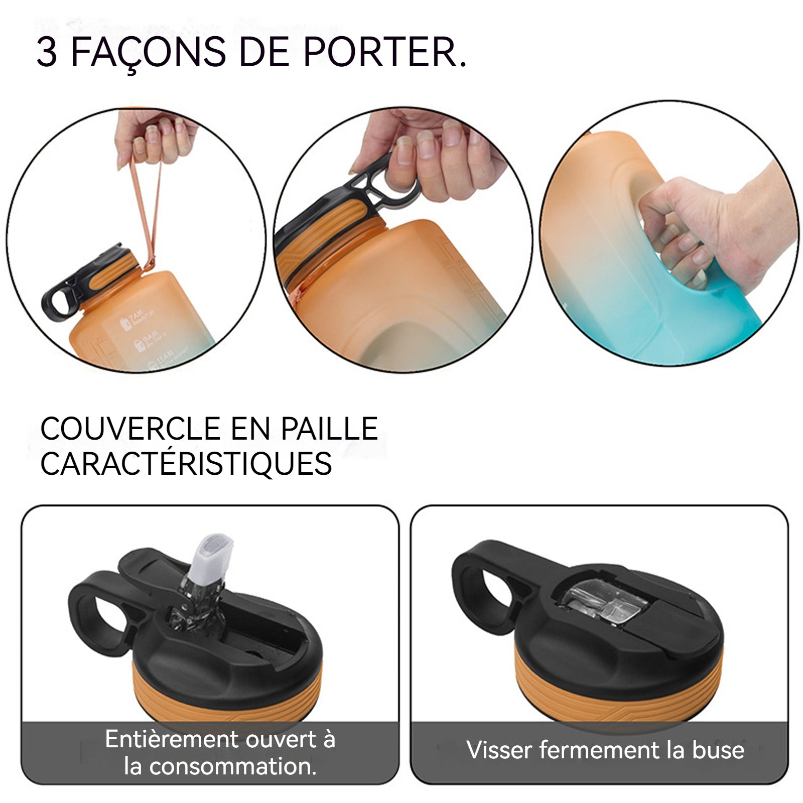 4. Couleurs dynamiques : Ce produit est conçu avec une bouteille dégradée orange et verte, à la fois simple et pleine de vitalité. De plus, la bouteille est dotée de marques de mesure claires, facilitant une compréhension intuitive de vos progrès en matière de consommation d'eau.