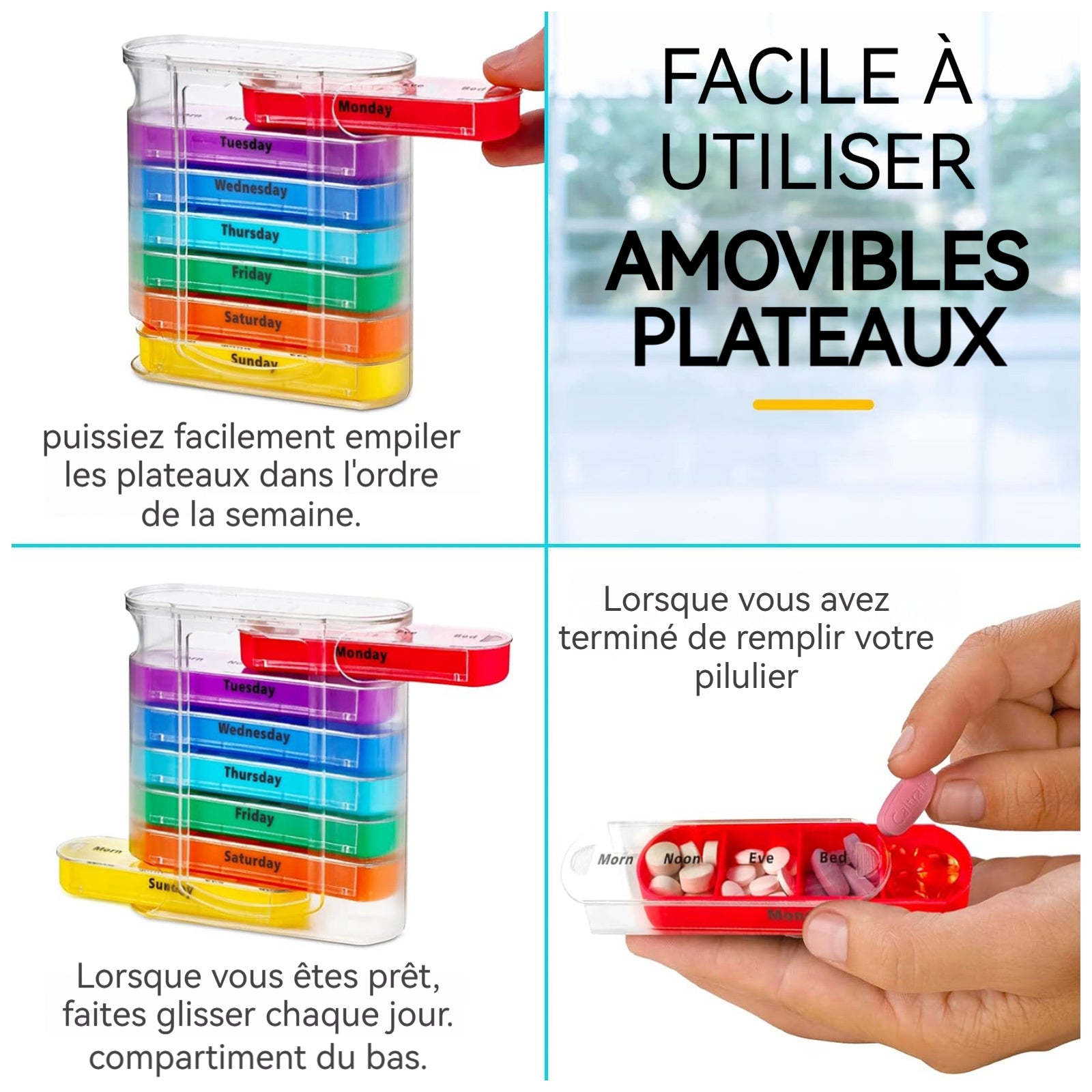 1, Compartiments hebdomadaires: Ce pilulier dispose d'un compartiment coloré pour chaque jour de la semaine (du lundi au dimanche), facilitant le classement des médicaments par jour et heure.