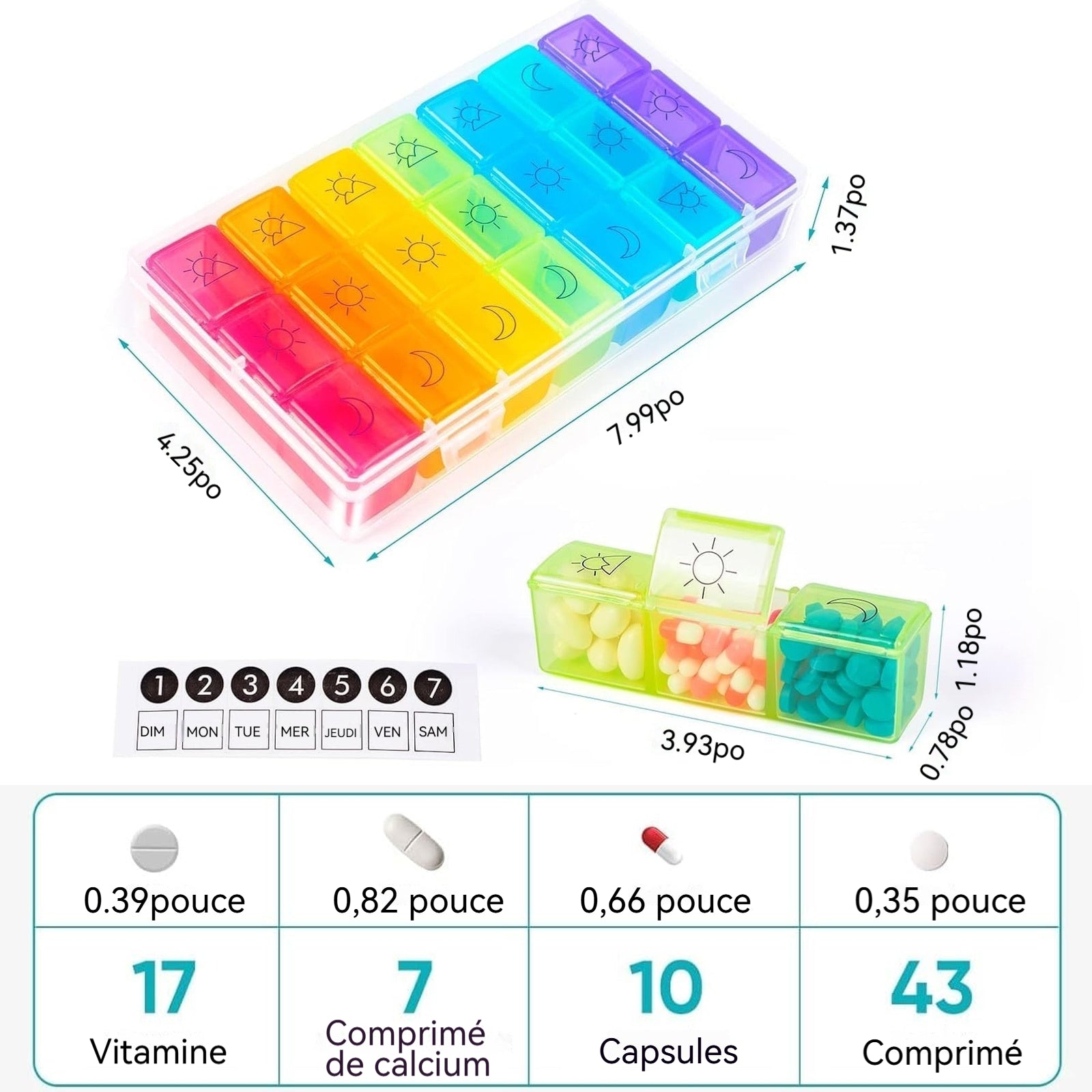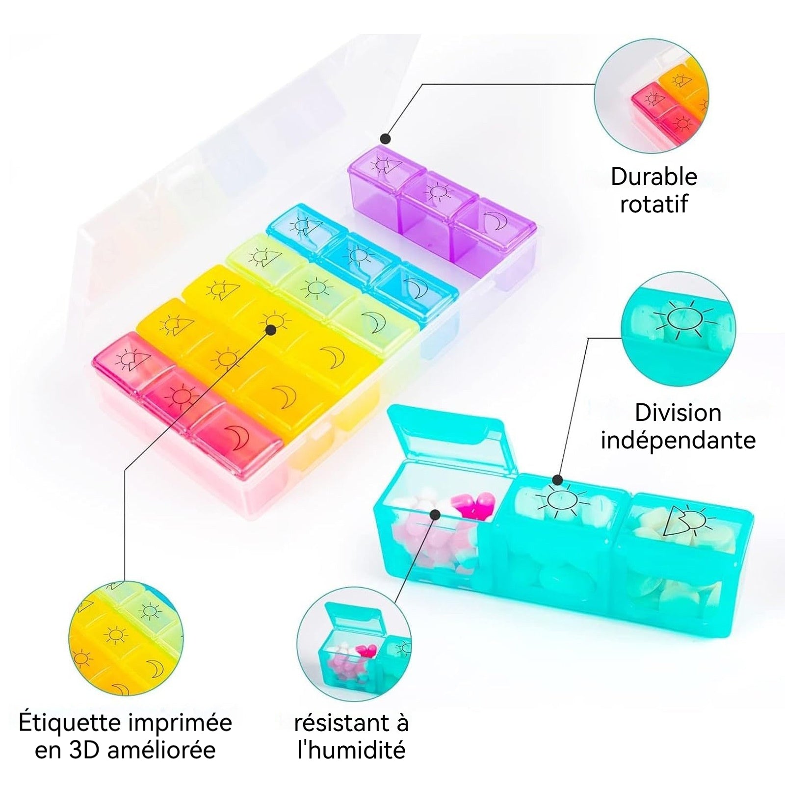 Pilulier 17cm 21 compartiments cycle de 7 jours Matériau PP coloré et écologique Conception de rangement indépendante et sûre