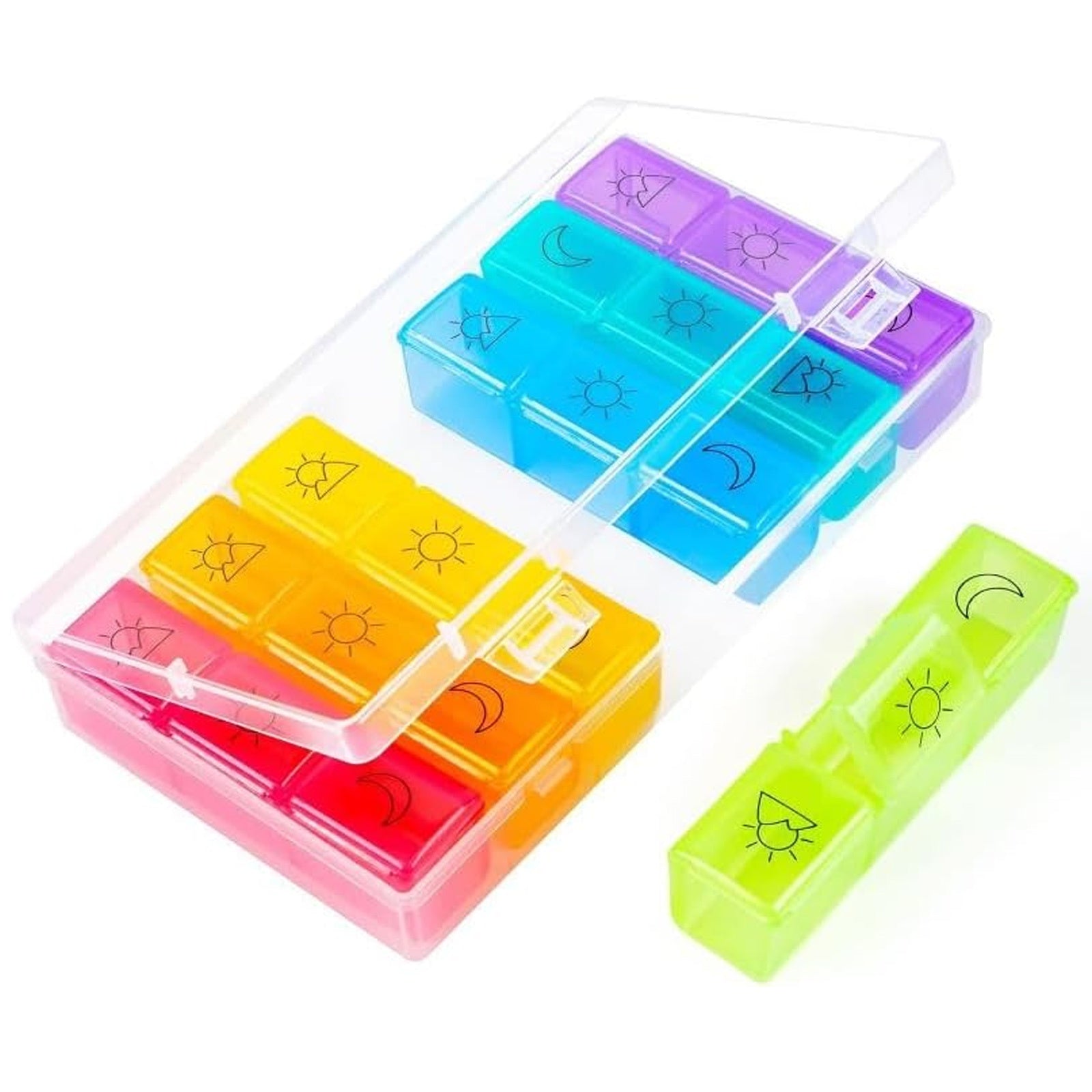 1, Stockage organisé: Ce boîtier à médicaments en PP écologique possède 21 compartiments indépendants avec un code couleur arc-en-ciel, chaque case étant marquée de motifs soleil/lune/étoile pour faciliter l'identification et le classement des médicaments.