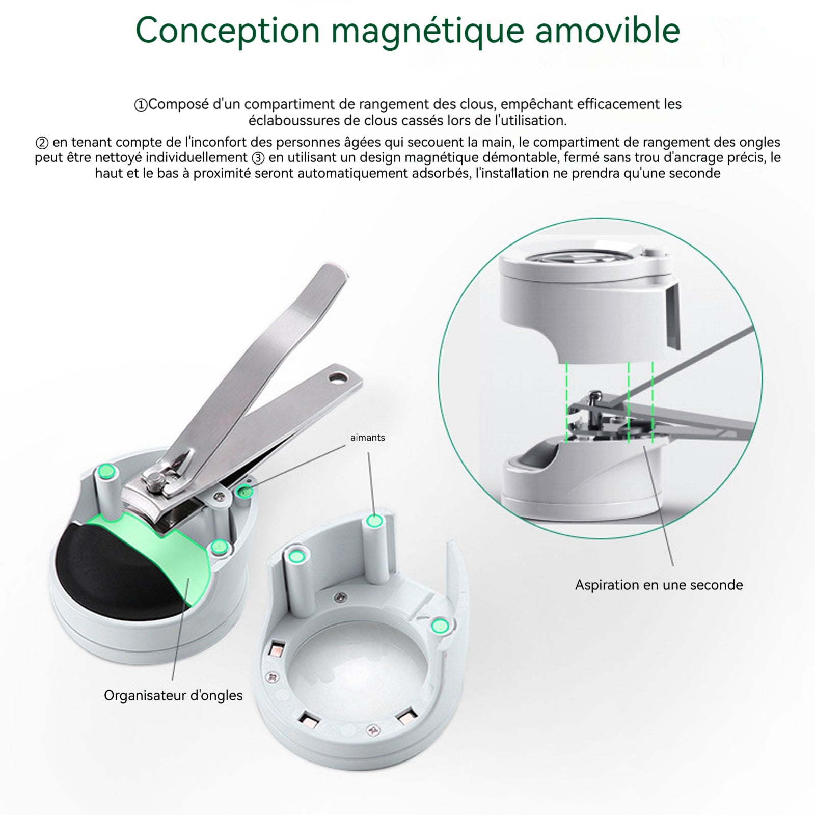 4. Démontable : Ce produit est équipé d'un compartiment de rangement pour les ongles, qui empêche efficacement les ongles cassés de se disperser lors de l'utilisation. En tenant compte des difficultés des personnes âgées avec des mains tremblantes, le compartiment de rangement peut être retiré facilement pour un nettoyage séparé, et il se ferme sans nécessiter un alignement précis ; il se fixe automatiquement lorsque les parties se rapprochent, et son installation ne prend qu'une seconde.