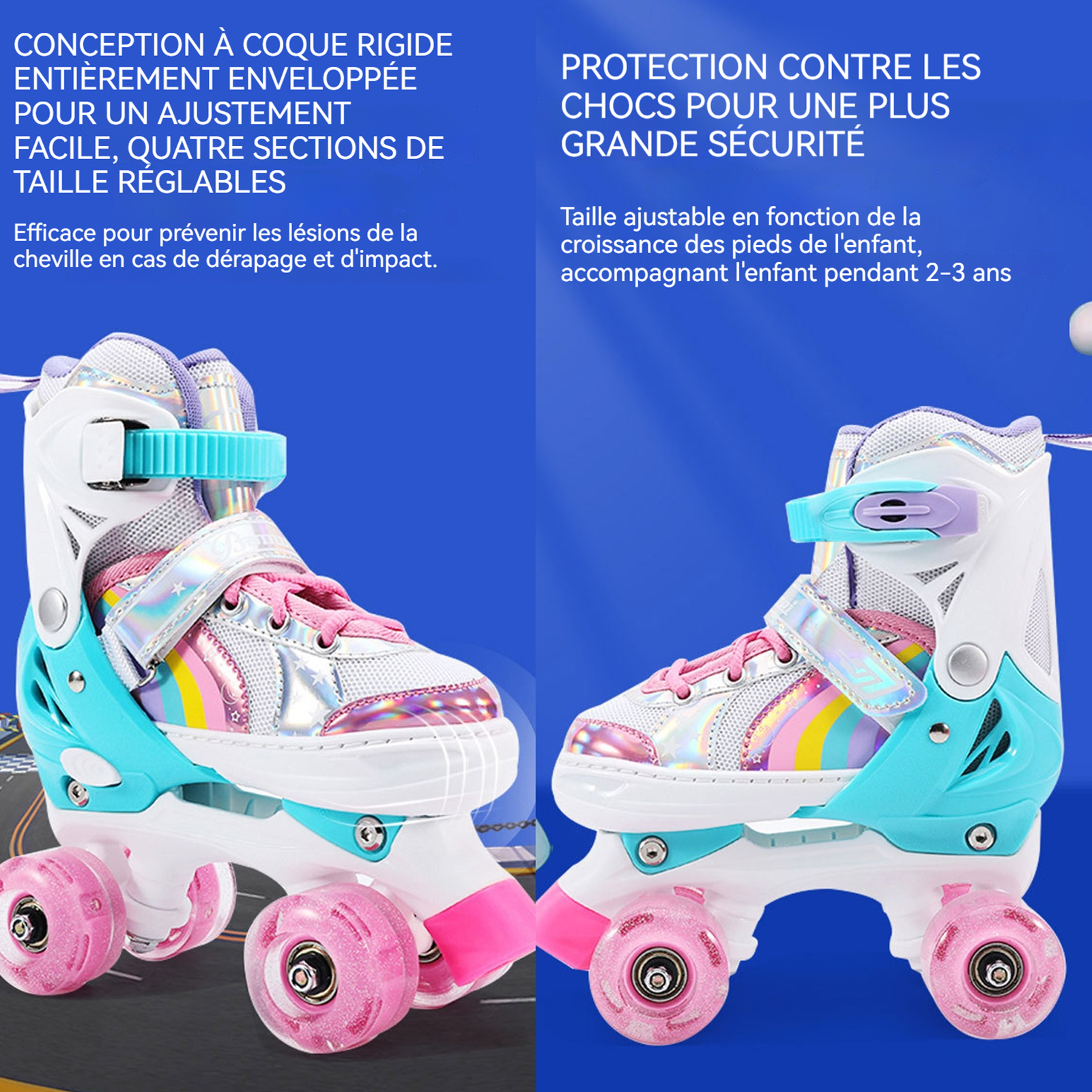 1. Conçu spécialement pour les débutants : Ces patins à roulettes sont équipés de huit roues lumineuses qui s'illuminent automatiquement lorsque vous commencez à patiner. Ces patins à roulettes offrent quatre tailles ajustables que vous pouvez régler à tout moment en fonction de la croissance de votre enfant.