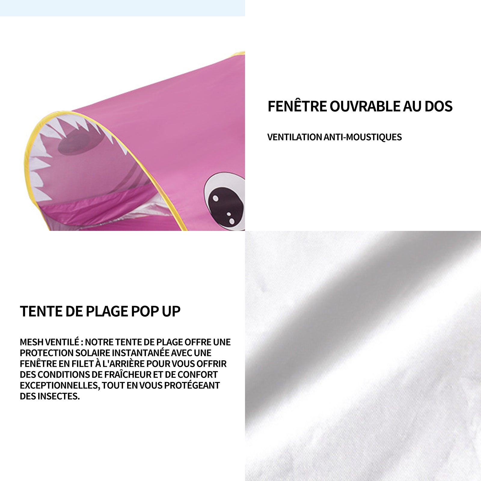 4. Tissu aéré : Notre tente de plage bloque instantanément le soleil et possède une fenêtre en filet à l'arrière pour vous offrir des conditions de fraîcheur et de confort exceptionnelles, tout en évitant les insectes indésirables.
