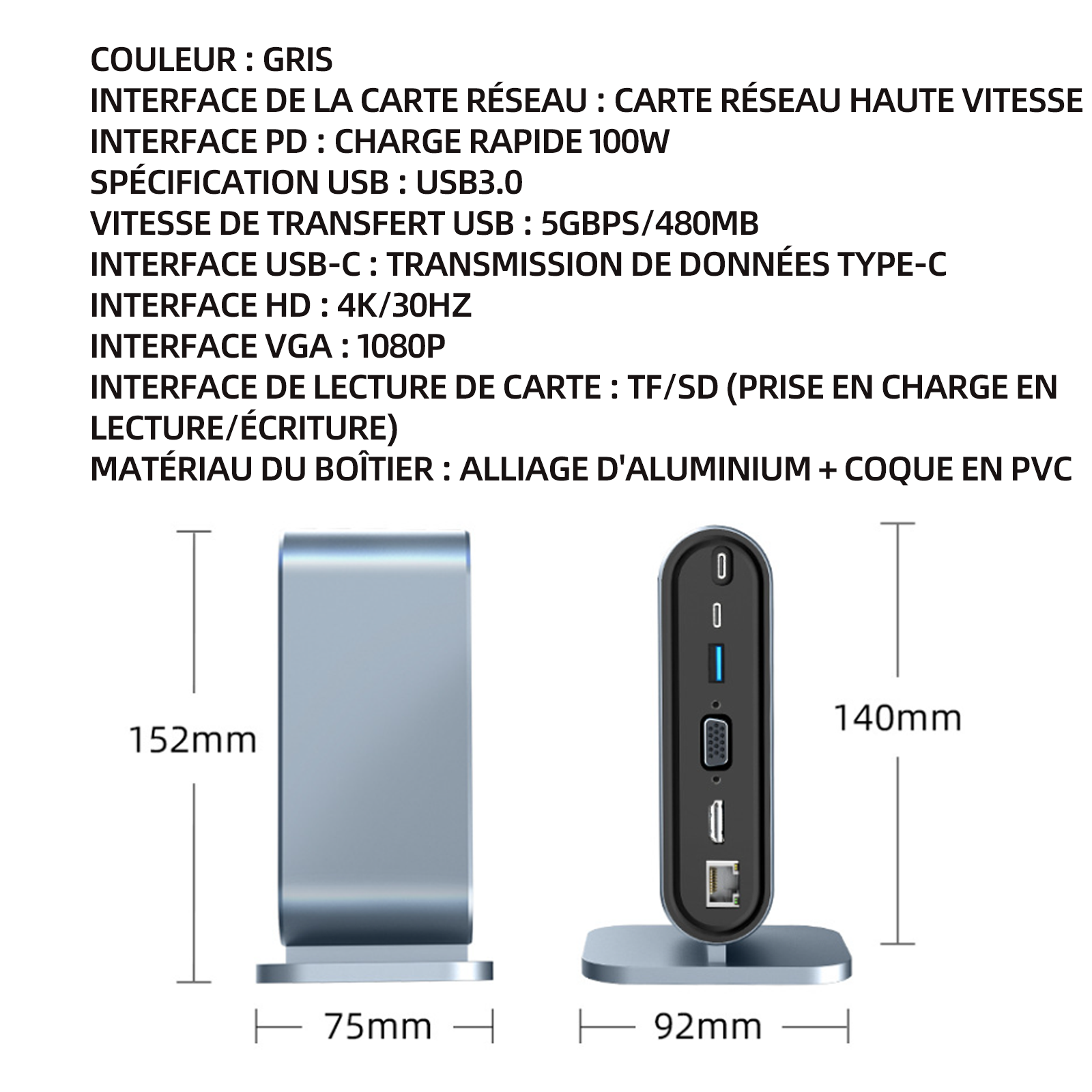 4. Extension de stockage : Les fentes pour cartes TF/SD de la station d'accueil prennent en charge les fonctions de lecture/écriture, offrant aux utilisateurs la possibilité d'étendre l'espace de stockage et de transférer rapidement des données.