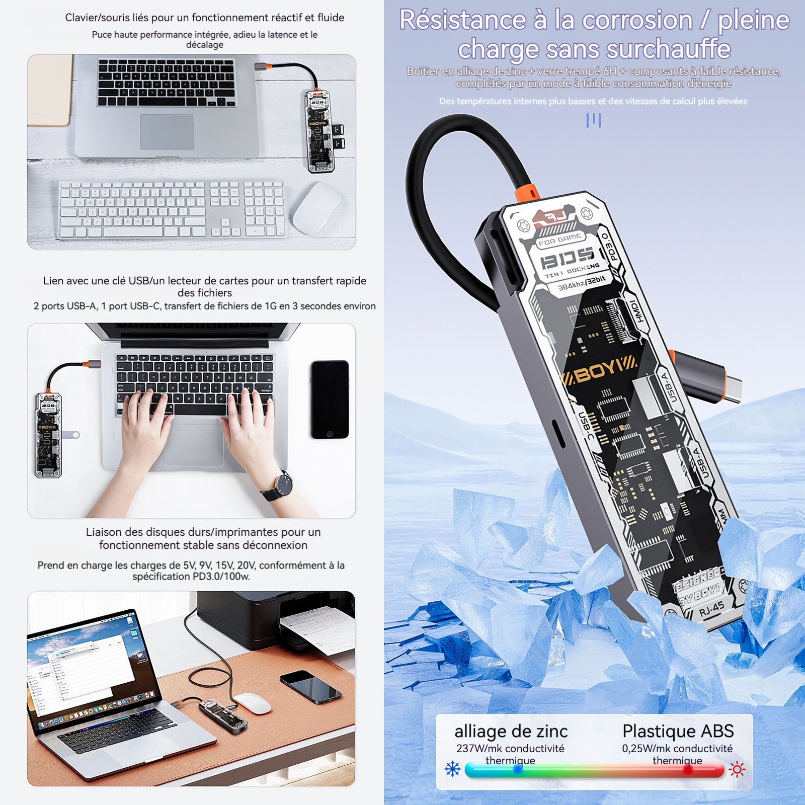 2. Vidéo haute définition : Le dock prend en charge la transmission HD 4K à 30Hz, offrant une image détaillée sur grand écran, et l'affichage double écran améliore l'efficacité du travail, enrichissant ainsi l'expérience visuelle.
