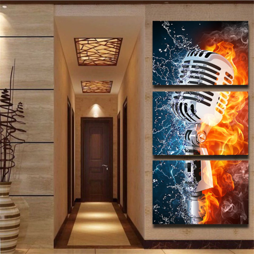 TD® Mur Art photos HD imprimé salon décor à la maison 3 pièces Microphone eau feu toile artistique peintures Rock musique affich