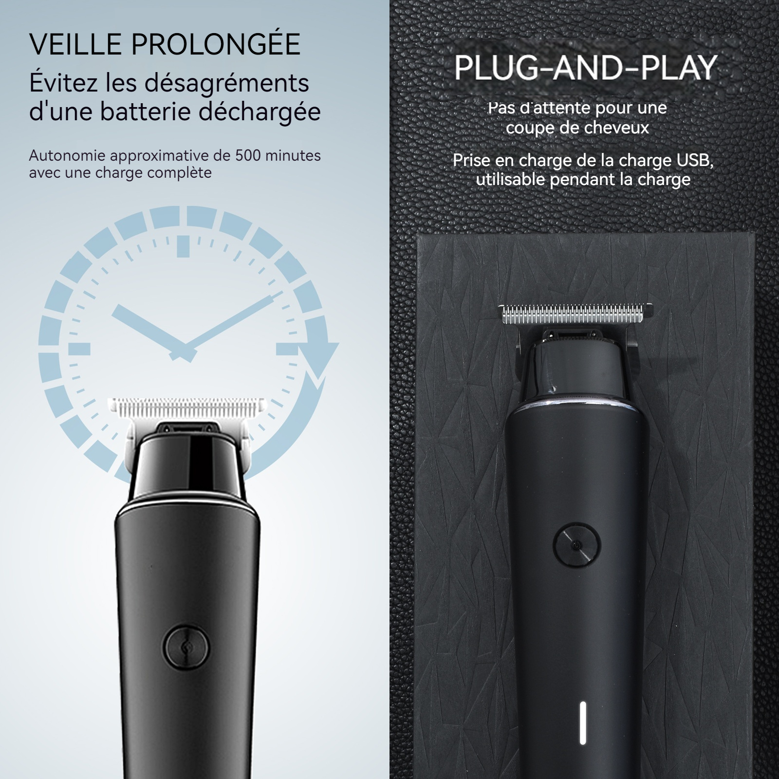2. Longue durée de vie de la batterie : cette tondeuse à cheveux adopte la méthode de chargement USB et a une forte compatibilité. Vous pouvez la charger via un ordinateur, une banque d'alimentation ou un adaptateur à tout moment et n'importe où, ce qui est très pratique. La grande batterie de 2 000 mAh prend en charge jusqu'à 500 minutes d'autonomie, adaptée à une utilisation fréquente ou à long terme.