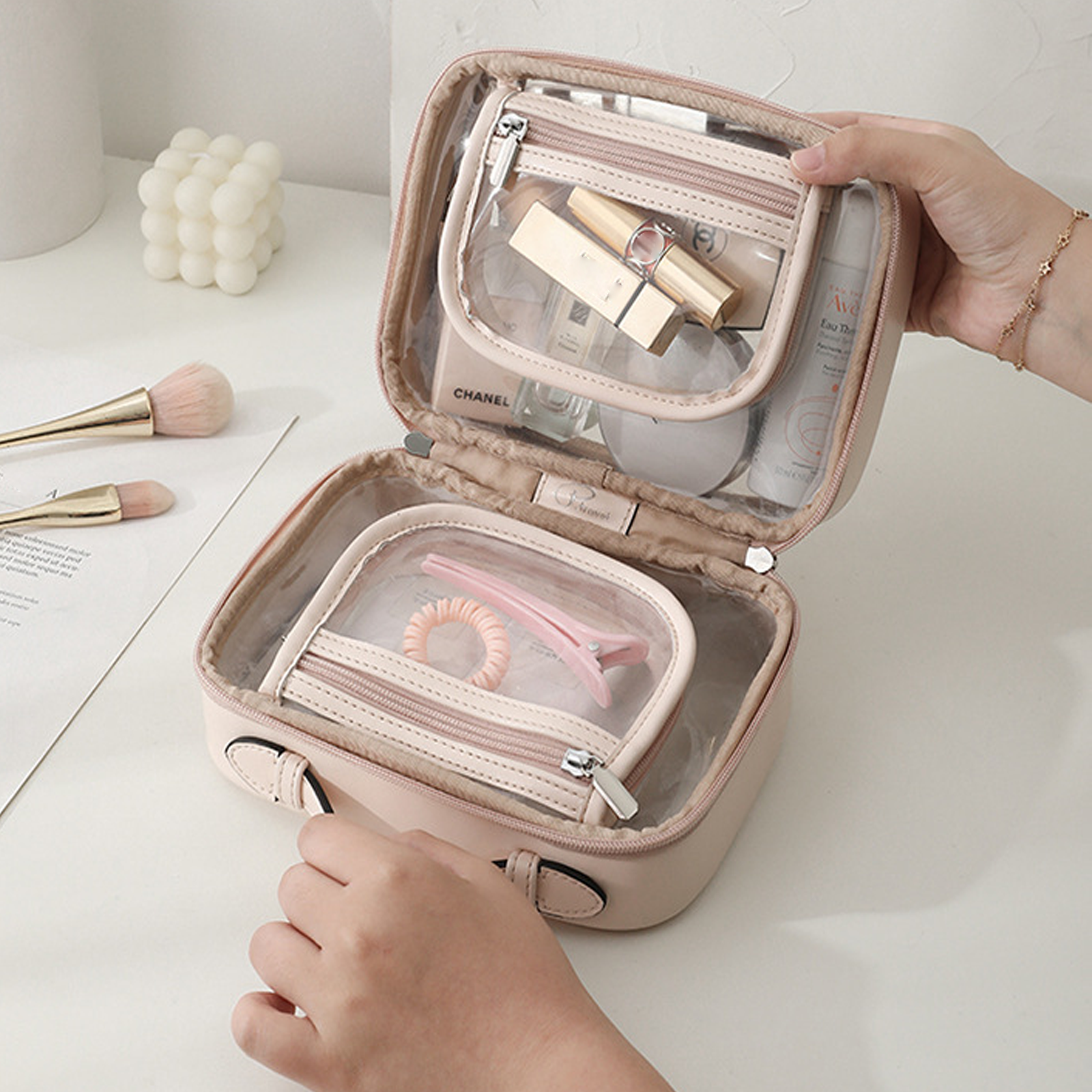 2. Matériaux imperméables : Le vanity est fabriqué en cuir imperméable, résistant à l'eau et à la poussière, offrant une bonne protection que ce soit pour les cosmétiques ou pour les produits de toilette.