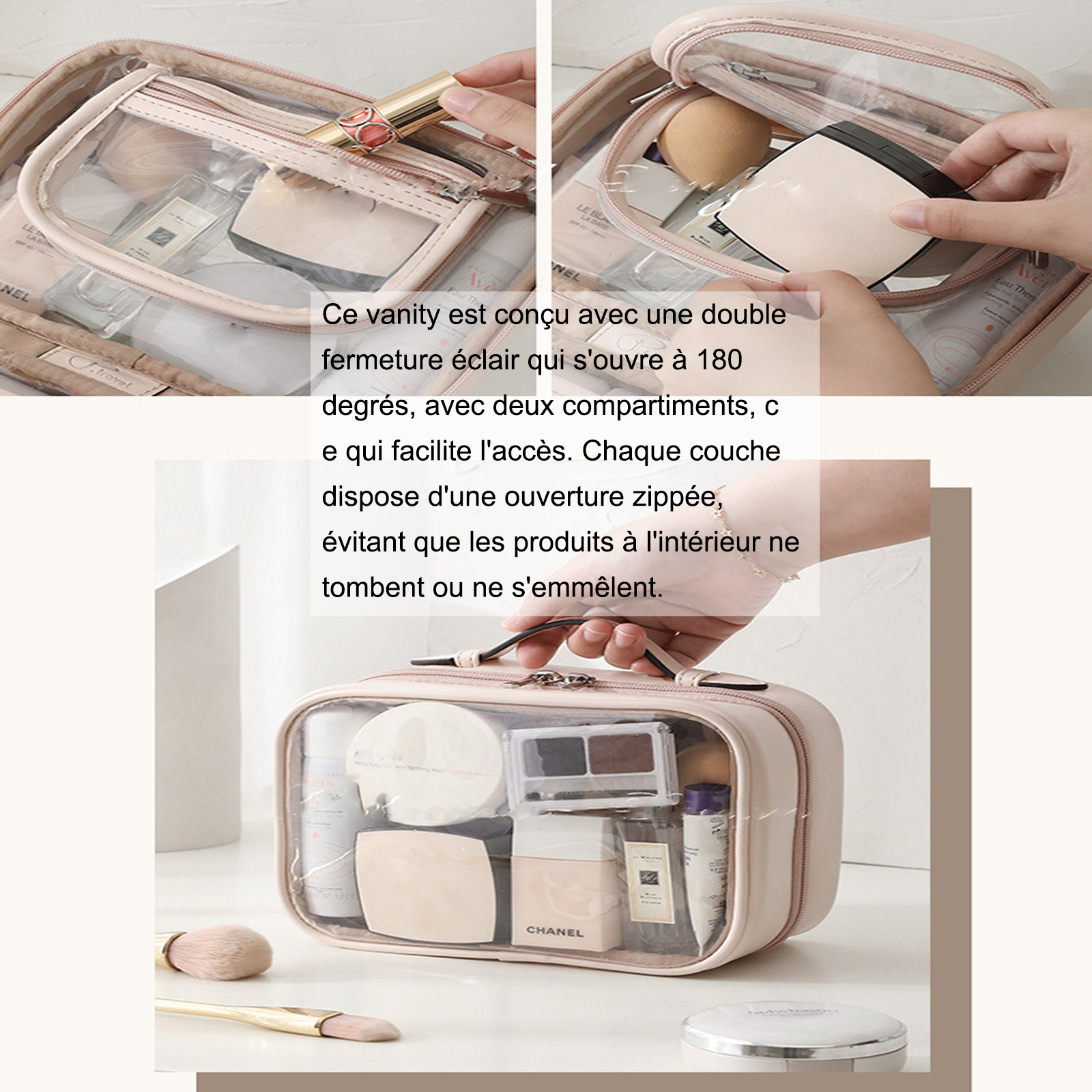 3. Grande ouverture : Ce vanity est conçu avec une double fermeture éclair qui s'ouvre à 180 degrés, avec deux compartiments, ce qui facilite l'accès. Chaque couche dispose d'une ouverture zippée, évitant que les produits à l'intérieur ne tombent ou ne s'emmêlent.