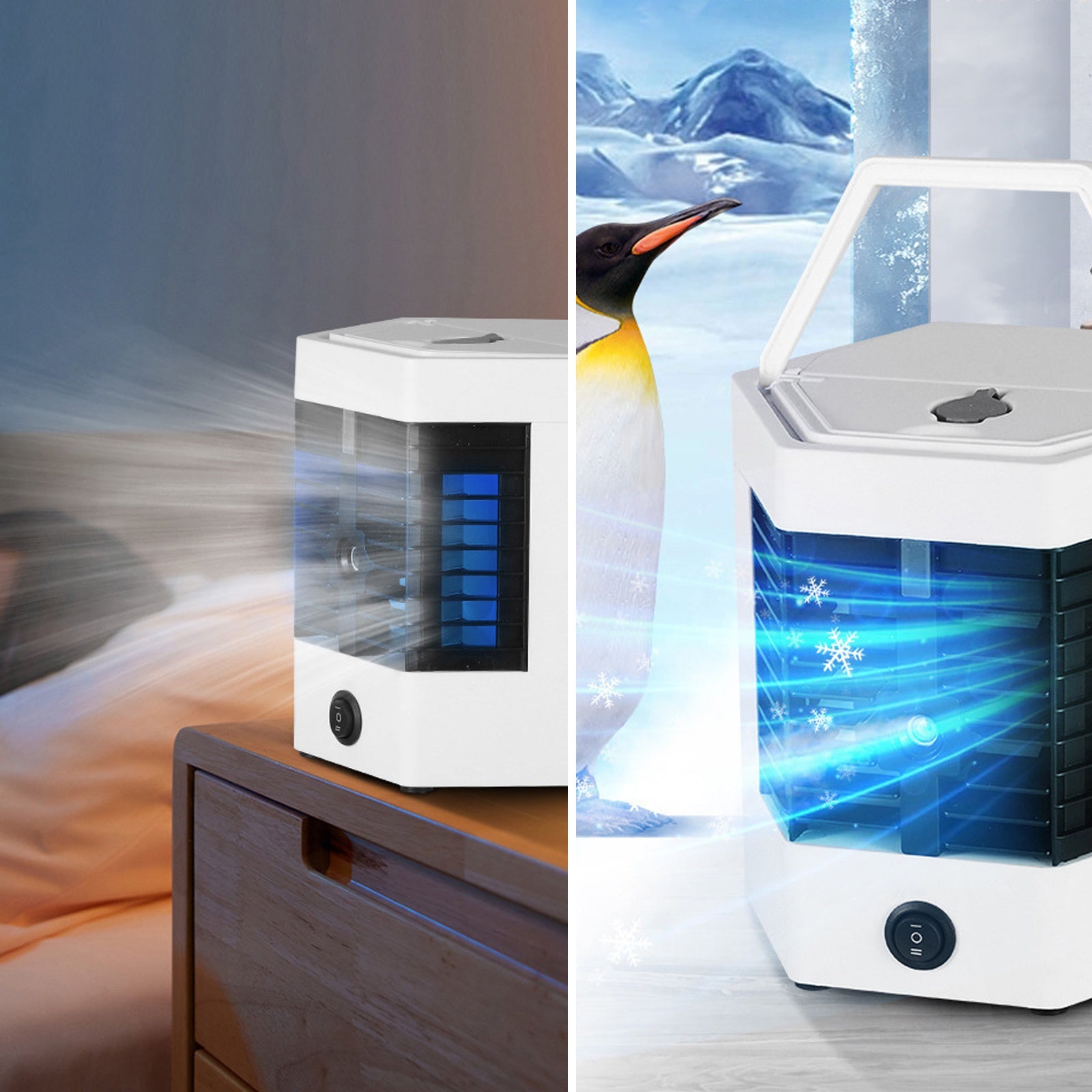 2, Expérience glaciale : Le mini ventilateur intègre un double bac à glaçons amovible, supportant l'ajout d'eau et de glace. Avec la fonte et l'évaporation des glaçons propulsées par le ventilateur, il refroidit rapidement l'environnement pour une sensation de fraîcheur immédiate.