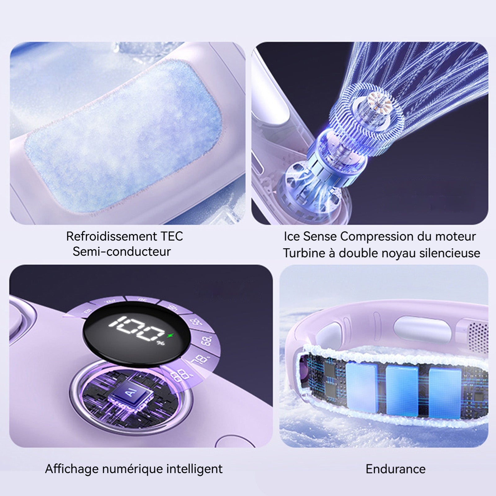 1. Technologie de double refroidissement : Ce ventilateur de cou utilise une double technologie de soufflage d'air froid et de refroidissement semiconductor TEC pour un refroidissement rapide, offrant un effet frais plus durable. Il dispose de 5 vitesses de vent réglables, répondant aux besoins de refroidissement dans différents environnements.